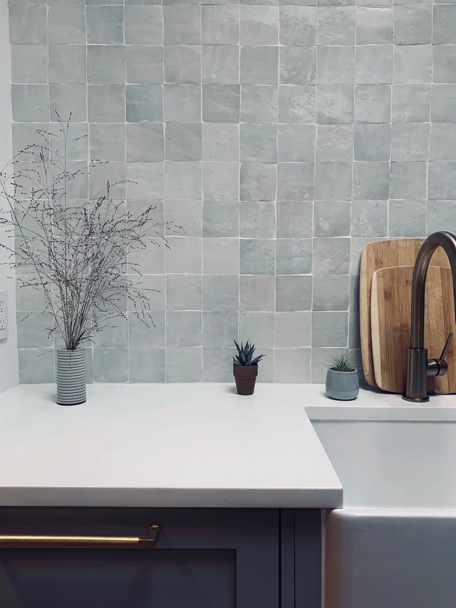 We went all the way (up the 10’ ceilings) with the Clé Zellige Moroccan tile. It’s just so beautiful. DIY shaker cabinet fronts by Semihandmade with Cedar&Moss brass hardware.